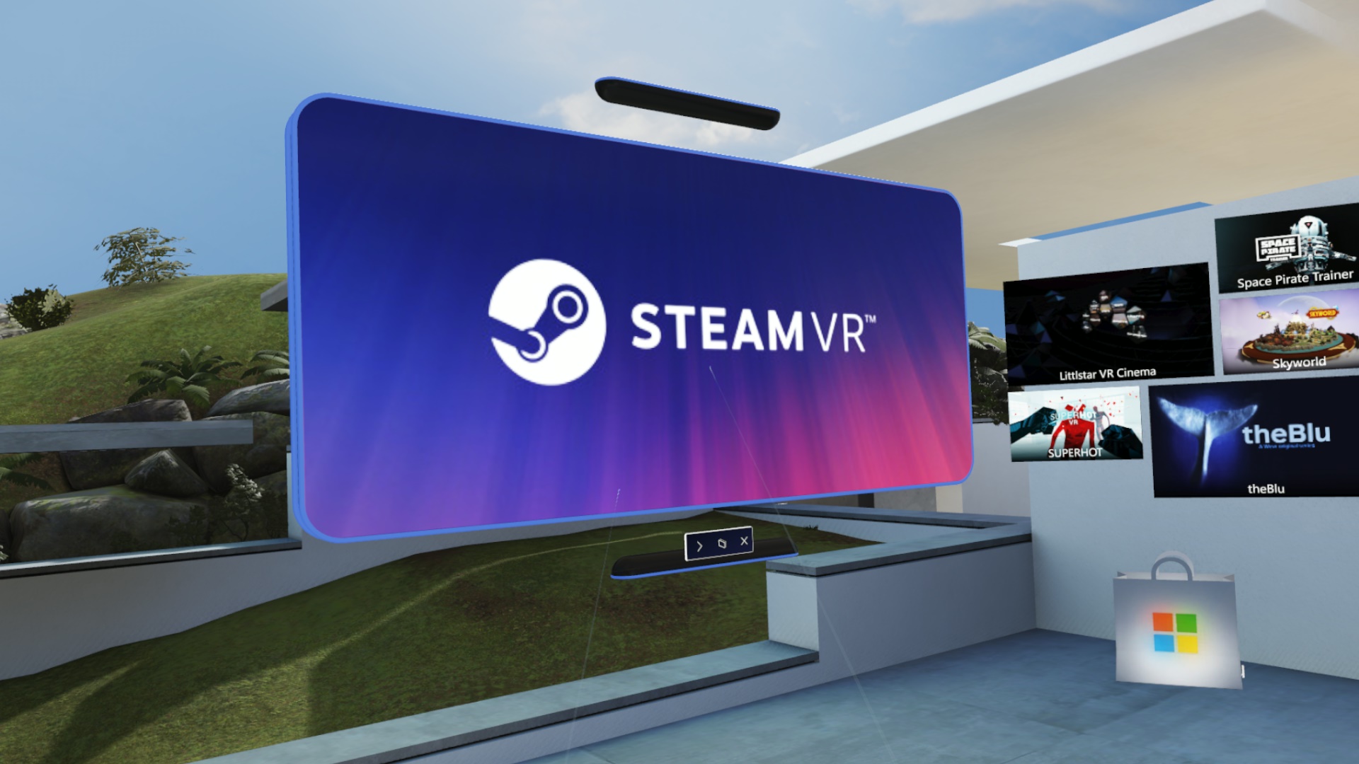 Terminato il setup iniziale ci verrà chiesto di indossare il visore e di eseguire un breve tutorial. Una volta finito ci ritroveremo all’interno della Home dei visori Windows Mixed Reality, chiamata Cliff House. Essa è composta da varie stanze e qualche vista panoramica, ma è sostanzialmente vuota, così come ci appare il desktop del nostro PC una volta formattato. Al di là di qualche schermata dedicata al browser, alla posta elettronica e alla visione di video, e ad alcuni collegamenti a delle demo, non troveremo niente di utile: starà a noi riempirla con i collegamenti che più ci aggradano. Farlo è relativamente semplice: basterà premere il tasto Windows sul nostro controller per fare apparire un’utilissima finestra, che ci permetterà di “trasportare” qualsiasi icona presente nel nostro desktop all’interno della Cliff House. Attraverso questa finestra poi sarà possibile effettuare screenshot e video (purtroppo di bassa qualità) di ciò che stiamo osservando all’interno del visore, regolare il volume delle cuffie, oltre che a fare apparire il desktop del nostro PC in qualsiasi momento vogliamo vederlo. Io personalmente ho inserito un’icona bella grande di SteamVR da cliccare immediatamente una volta indossato il visore. Sarà proprio l’ambiente di Valve la vera casa per chi il G2 lo userà nel gaming. Sempre da questa finestra è possibile attivare il Passthrough, che funziona in maniera un po’ particolare: i nostri controller infatti diventeranno come delle torce e puntandoli verso una direzione ci mostreranno una porzione della nostra stanza. Ho trovato questa funzione praticamente inutile, visto che ci costringe a tenere in mano almeno un controller e la qualità di ciò che vediamo è molto scadente.