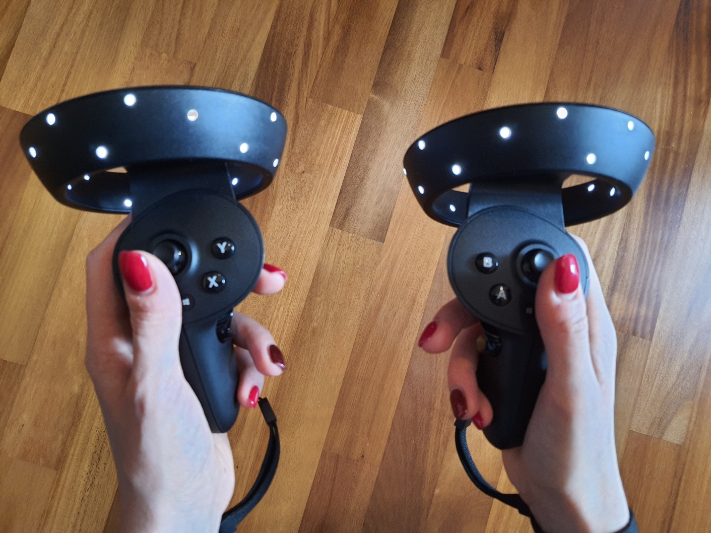 I controller, come ho detto prima, non trasmettono la stessa qualità del visore. Purtroppo la tendenza ad utilizzare delle plastiche più economiche è stata seguita anche da Oculus per i touch del Quest 2, ciò non giustifica comunque la scelta di HP. In ogni caso l’ergonomia è ottima, pesano il giusto e non li ho mai trovati poco confortevoli durante l’utilizzo. Anzi, il fatto che la parte “piatta” (dove alloggiano il thumbstick ed i pulsanti) rispetto all’impugnatura abbia un’inclinazione inferiore, me li ha fatti preferire rispetto agli ultimi controller di Facebook (ma qui ammetto che si entra nel personale). Inoltre sono un po’ meno tozzi, ma comunque più grandi dei touch del Rift S e del Quest 1, quindi più simili come dimensioni ai touch del CV1 che rimangono tutt’ora i miei controller preferiti. Gli anelli dove alloggiano i LED per il tracking rimangono purtroppo della stessa grandezza dei vecchi controller WMR, e può capitare che vengano a contatto in alcune situazioni di gioco, come quando si ricarica la pistola. La buona notizia è che sembrano molto resistenti agli urti, ed il fatto che la staffa “ad L” che li connette al controller sia flessibile permette di scaricare meglio l’energia in caso di botta accidentale. I pulsanti sono esattamente uguali come numerazione e come posizione a quelli dei touch Oculus, e questo non può che favorire la compatibilità nei giochi (come visto prima). I pulsanti A/B e X/Y sono un po’ più piccoli e hanno molta meno corsa rispetto alla loro controparte, ma non ho mai trovato questo un problema. Anche i trigger hanno un po’ meno corsa, pur rimanendo analogici, mentre i thumbstick sono veramente molto simili. Troviamo infine un pulsante Windows (che apre sempre quella finestra vista quando parlavo della Cliff House) ed un pulsante menu per ciascun controller. In questo caso quindi si guadagna un pulsante rispetto ai touch Oculus, cosa che può sempre rivelarsi utile in alcuni giochi.