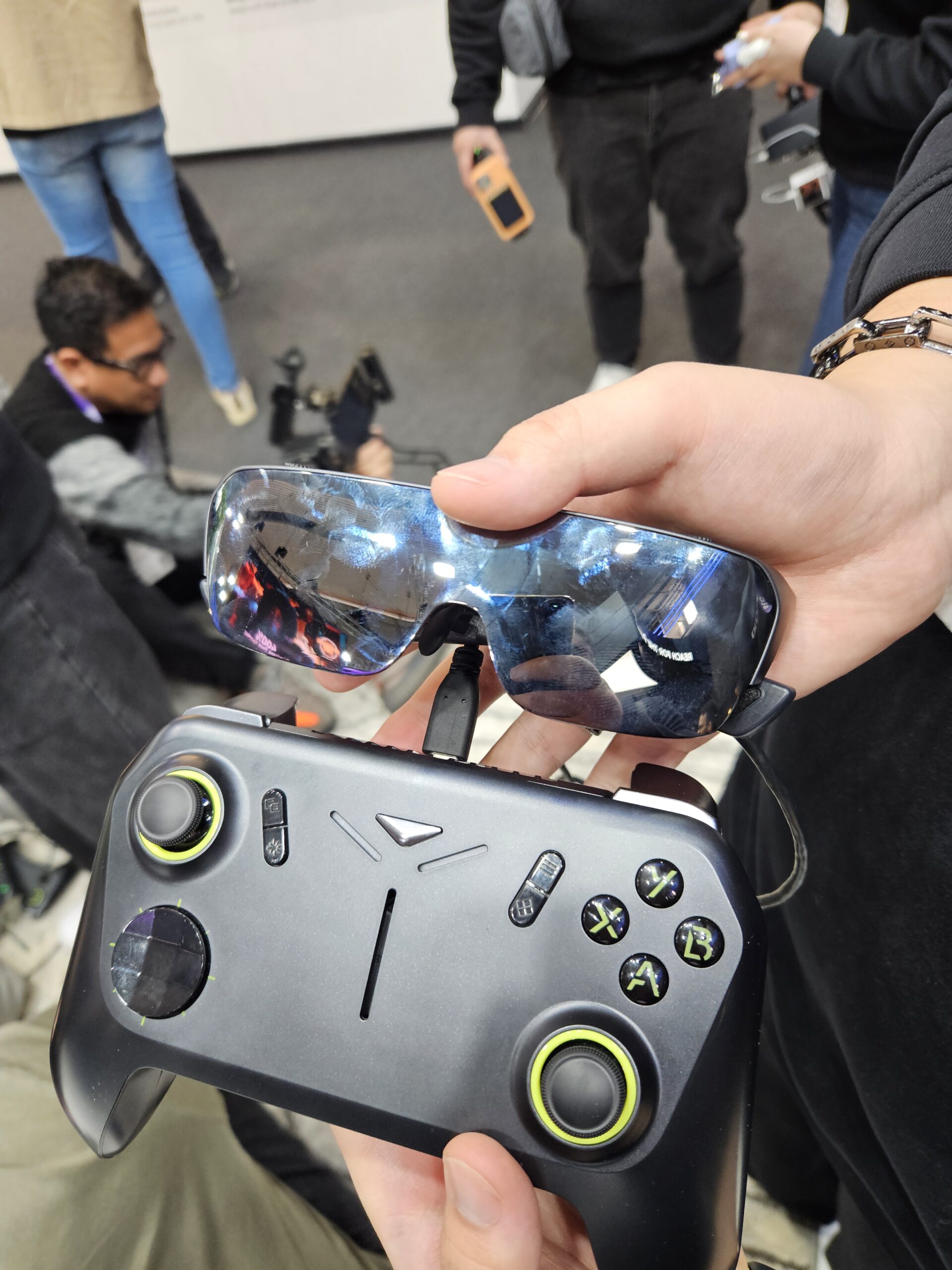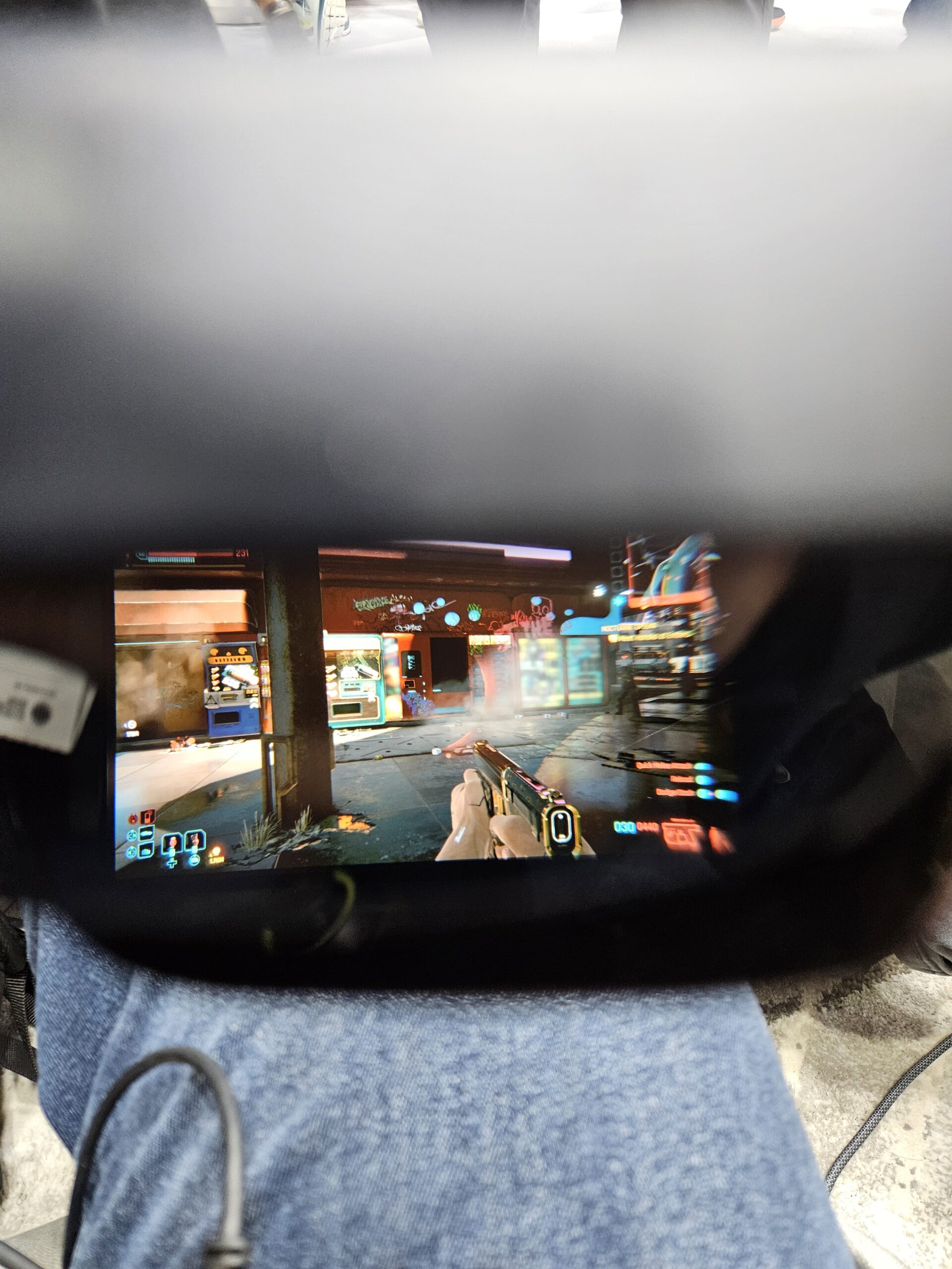 Infatti all’interno del controller è presente un vero e proprio PC Windows con cui abbiamo giocato a Cyberpunk 2077, comodamente seduti su di una poltroncina. Il Poket Go monta al suo interno un processore AMD Ryzen 7 8840HS, 16 Gb di Ram LPDDR5, 1Tb di memoria e con una visione dello schermo all’incirca di una tv da 215 pollici. Purtroppo però per quanto la tecnologia sia piuttosto interessante ed il gioco girava in maniera piuttosto fluida senza cali di frame, non pensiamo che sia la soluzione più comoda per giocare ad un videogioco Flat, dato che comunque l’esperienza finale non differisce poi molto da quella tradizionale a differenza di quello che avviene indossando un visore per la realtà virtuale.