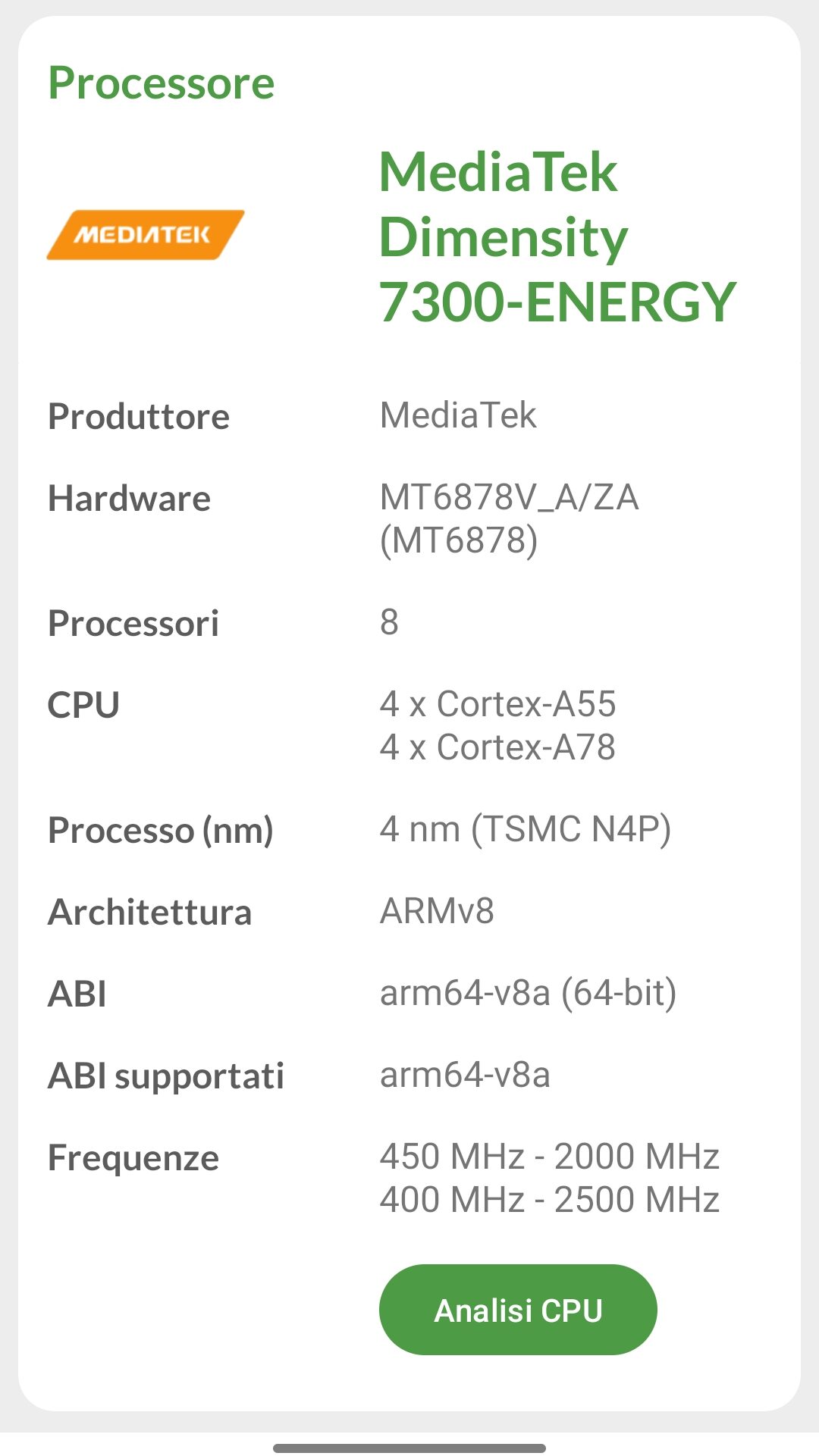 Sotto la scocca troviamo un MediaTek Dimensity 7300 Energy, che si è dimostrato molto affidabile e fluido, senza problemi di surriscaldamento o rallentamenti, anche dopo intensi test con applicazioni di benchmark.