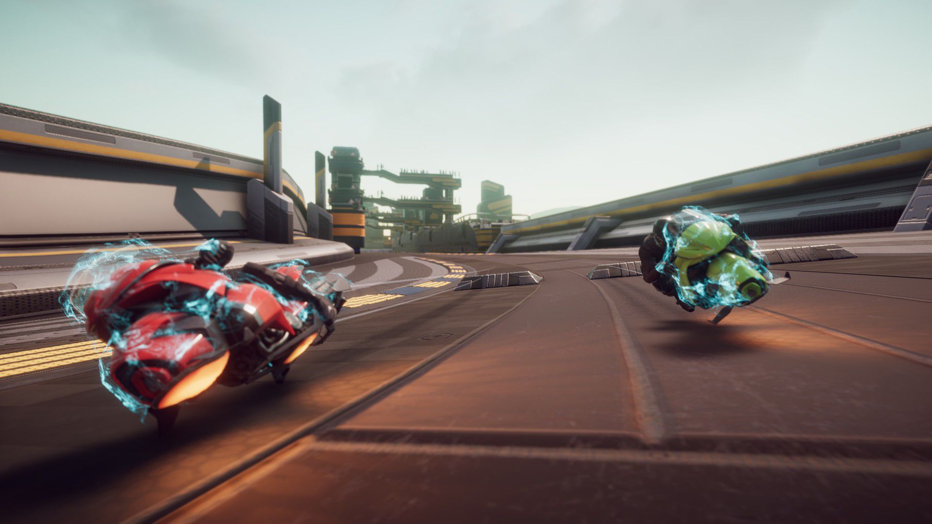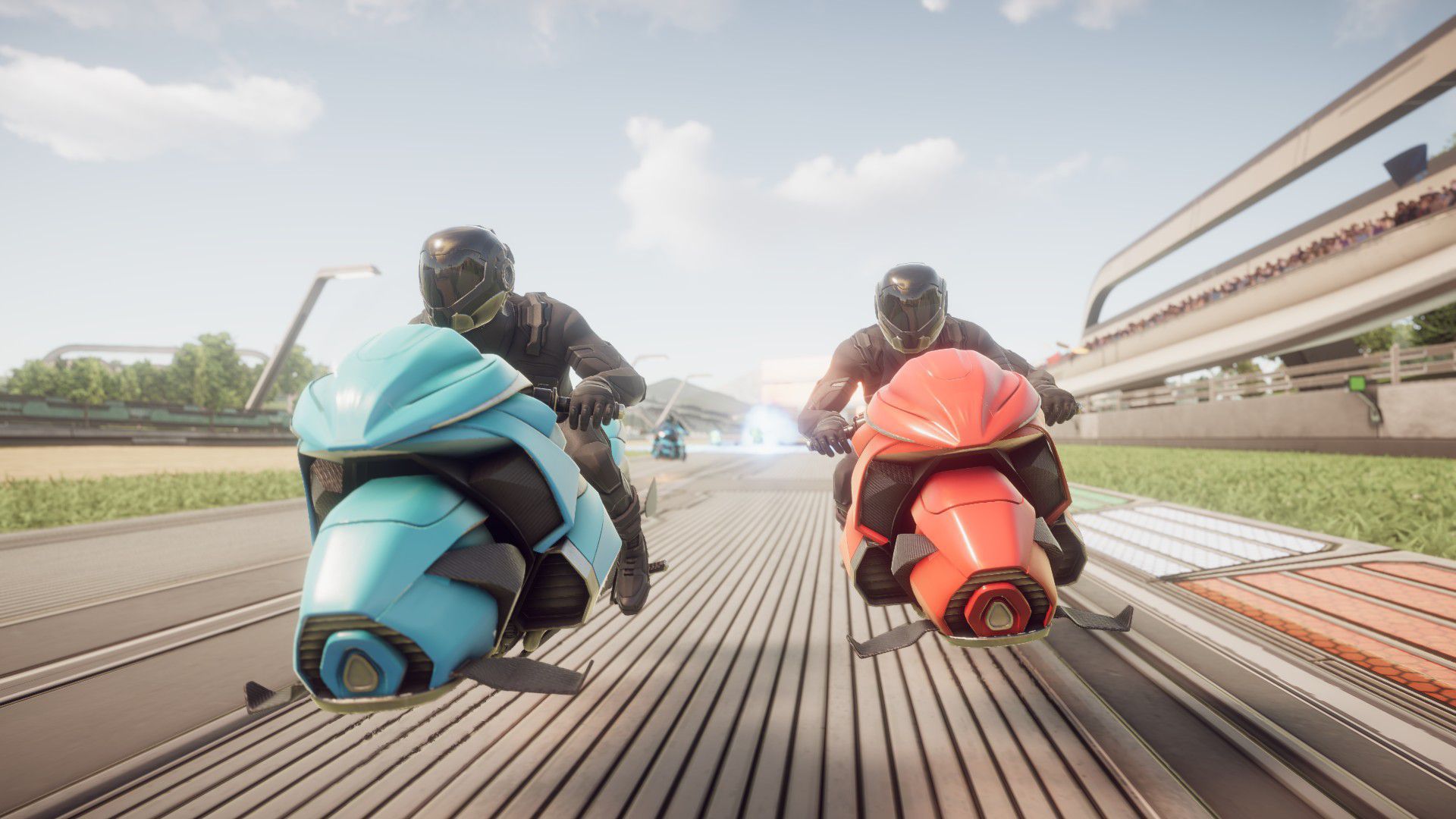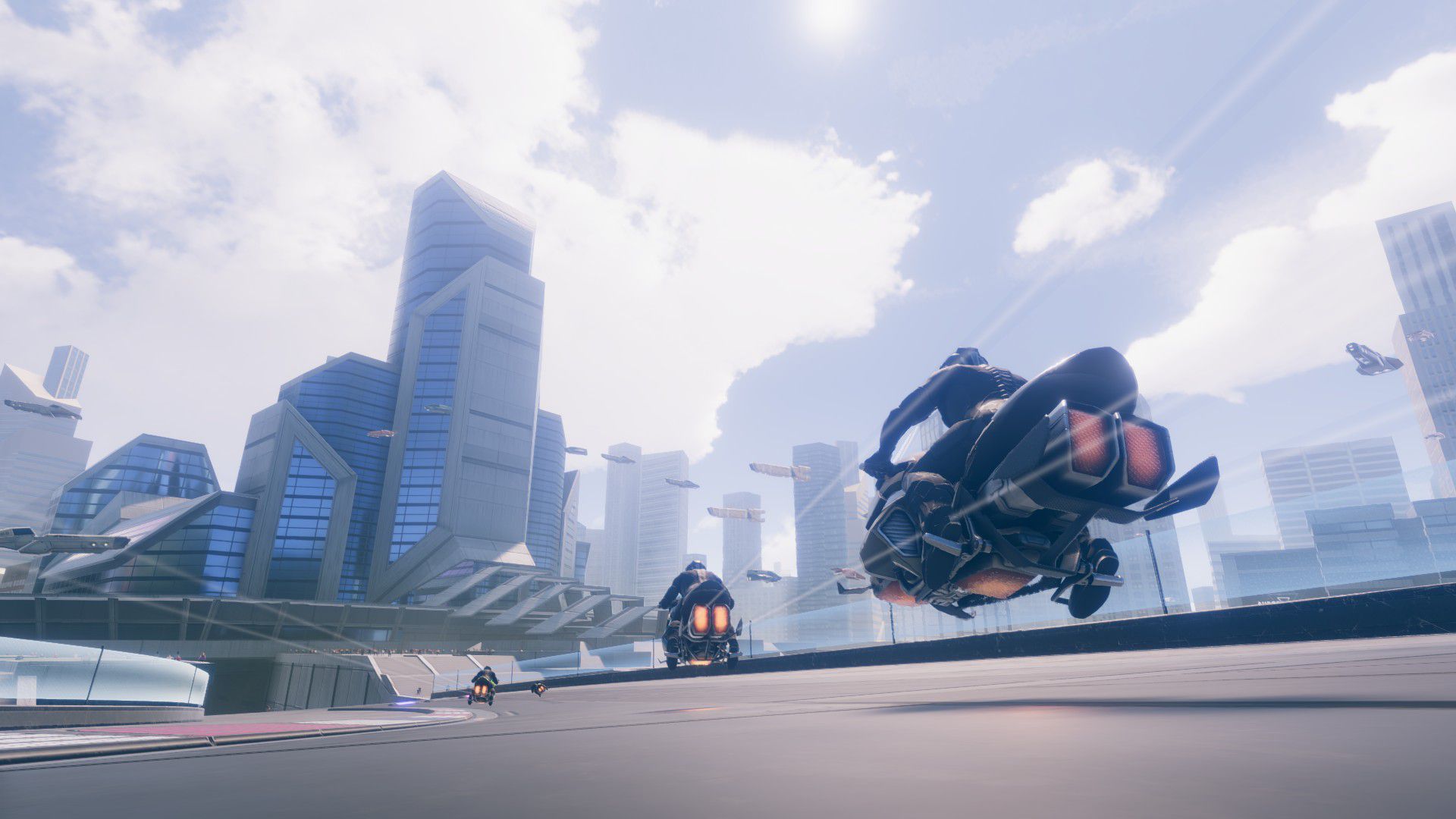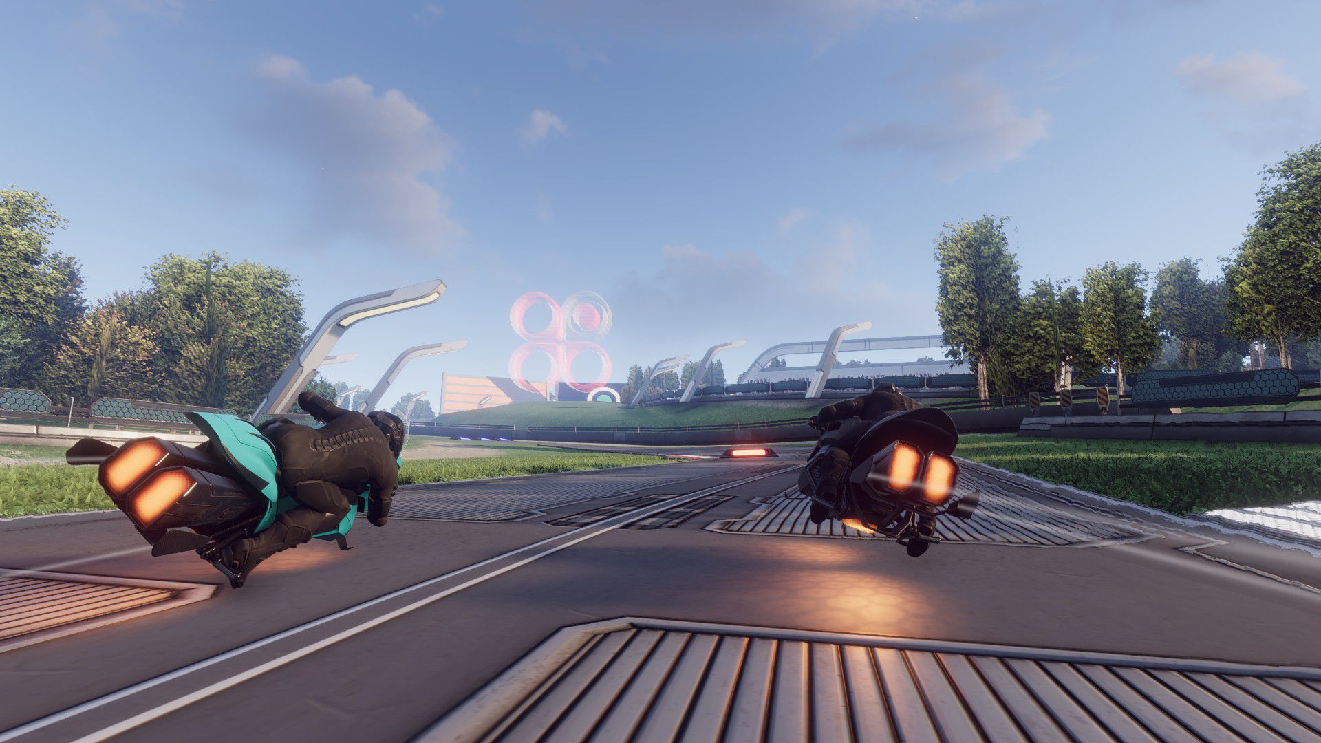 Lunghissimo preambolo per definire il vero punto di forza di V-Racer Hoverbike, il sistema di controllo implementato è il migliore visto finora e riproduce ragionevolmente bene l’esperienza di guida. Il titolo è in uscita in accesso anticipato, con una lunga strada di sviluppo da percorrere visto che le sbavature sono ancora parecchie, ma avendo pienamente centrato l’elemento chiave del gameplay. Trattasi di un titolo di corse futuribili che a tratti può ricordare Wipeout, le cui moto fluttuano a trenta centimetri dal suolo. Per vari elementi d’altro canto si è cercato di stare più vicini ad un contesto realistico: innanzitutto le velocità in oggetto sono relativamente simili a quelle di vere motociclette stradali, ma anche le piste sebbene stilizzate presentano curve ed avvallamenti plausibili contro i vari giri della morte dei cloni di Wipeout e F-Zero.