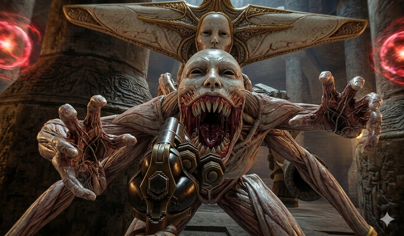 Perché WRATH costruisce un universo completamente dominato da un senso di decadenza. Non è il classico inferno demoniaco di Doom, non è neanche il gothic industrial di Quake. È qualcosa di più strano, più alieno. Un mondo che sembra sospeso tra religione, carne e rovina. Tutto sembra antico, ma non in senso storico… in senso cosmico. Come se steste camminando tra i resti di qualcosa che esisteva molto prima di qualsiasi cosa possiate comprendere.
